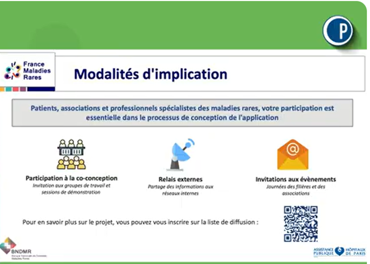 Victor Hannotiaux invite les patients, associations et professionnels à participer à la co-conception et aux démonstrations pour façonner l’outil selon leurs besoins : un QRcode permet de s’inscrire et de recevoir les mises à jour.