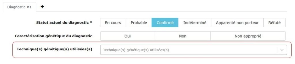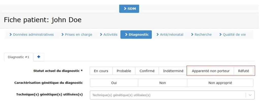 Dorénavant, pour préciser l’état du patient, deux nouveaux statuts du diagnostic« Apparenté non porteur » et « Réfuté »dans l’onglet « Diagnostic » ont été introduits.