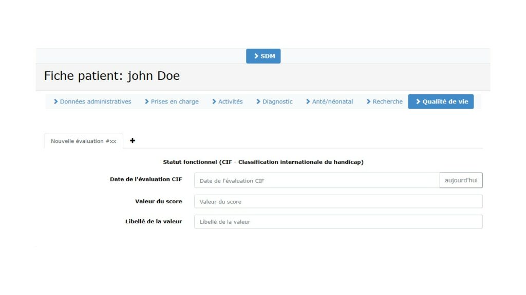 Dans ce nouvel et dernier onglet, il existe désormais la possibilité de renseigner des informations sur le statut fonctionnel du patient sur la base de la Classification Internationale du handicap (CIF) ; à savoir la date de la dernière évaluation CIF, la valeur du score et le libellé de la valeur.
