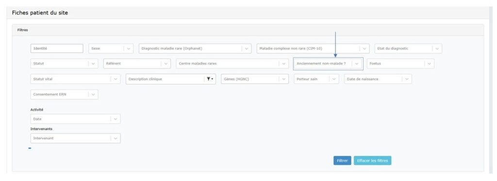 Les patients dont les fiches ont été créés avant cette date et déclarés « Non-malade », garderont encore cette information. Cependant, une action des utilisateurs est requise pour mettre à jour leur statut du diagnostic en « Apparenté non porteur » ou «Réfuté ». Pour faciliter la mise à jour de cette information, il est possible de retrouver les patients anciennement déclarés « Non-malade »en activant le filtre« Anciennement non malade ? »dans la section Fiches patient du site en cliquant sur (+) pour dérouler plus de filtres.
