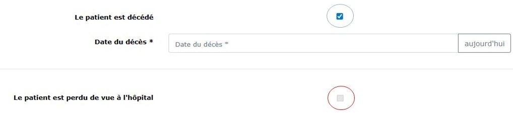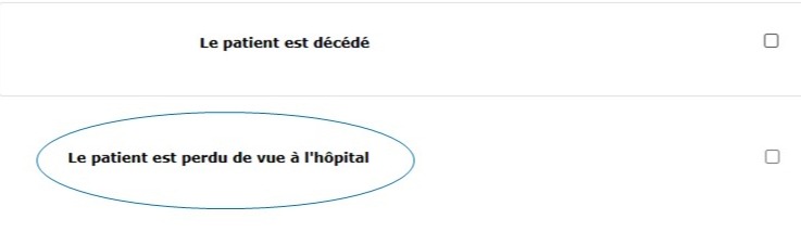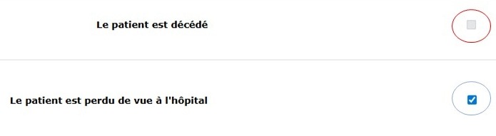 Si la case « Le patient est décédé » est cochée, la case pour déclarer que « Le patient est perdu de vue à l’hôpital » devient grisée.