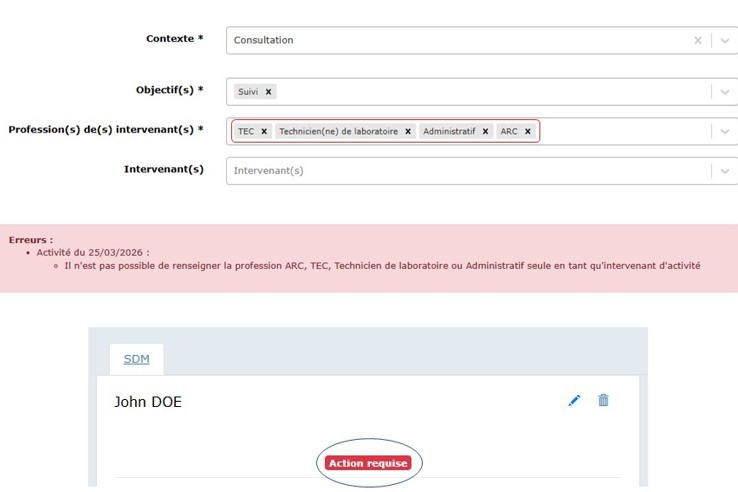 Une activité déclarée avec uniquement des intervenants de type ARC, TEC, technicien de laboratoire et administratif donne lieu à un message d’erreur et le statut de la fiche passe en « Action requise ».