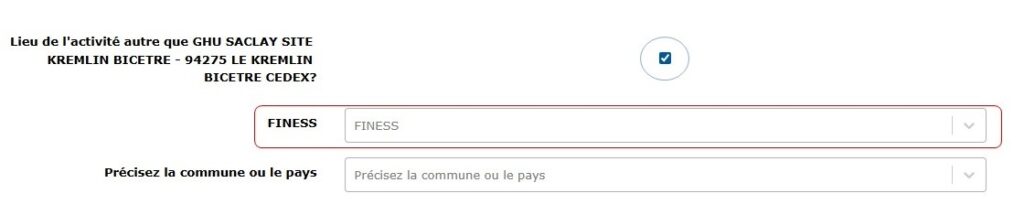 Si une activité est réalisée géographiquement en dehors du site pour lequel elle est déclarée, il est maintenant possible de préciser le FINESS de l’établissement dans lequel l’activité a été effectuée. Ce nouvel item apparait en cochant la case « Lieu de l’activité autre que (Nom de l’Hôpital dont le site est rattaché) ».